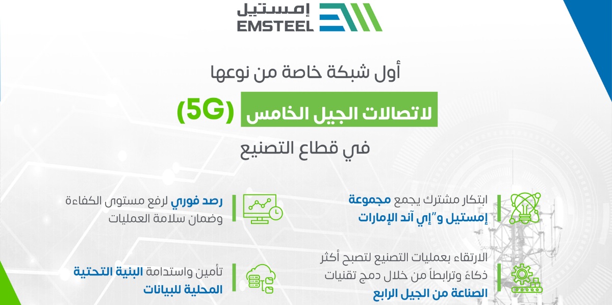 أعلنت مجموعة إمستيل، (المدرجة في سوق أبوظبي للأوراق المالية تحت الرمز: EMSTEEL)، (“المجموعة”)، إحدى أكبر الشركات المدرجة لإنتاج الحديد ومواد البناء في المنطقة، عن الإطلاق التجريبي الناجح لأول شبكة خاصة للجيل الخامس المتقدم في قطاع التصنيع، وذلك بالتعاون مع “إي آند الإمارات”.