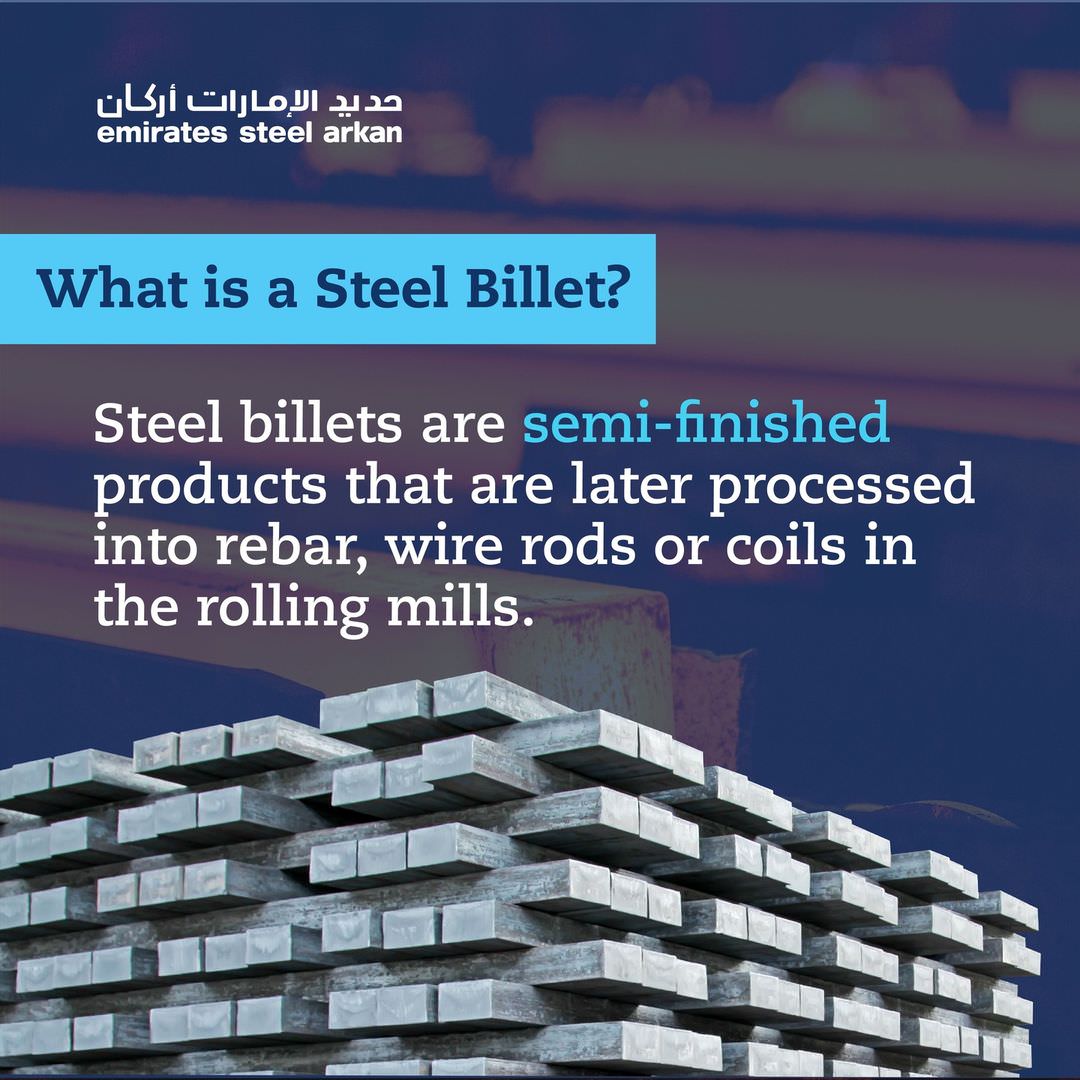 #Steel, which cannot be utilized in its pure form, must be cast into shape before it is used. The newly created steel, which is a solid bar of metal, is called steel billet. #EmiratesSteelArkan uses the continuous casting method to allow billets of varying lengths to be produced swiftly, efficiently, and more importantly, to the same quality of certified consistency and standard.